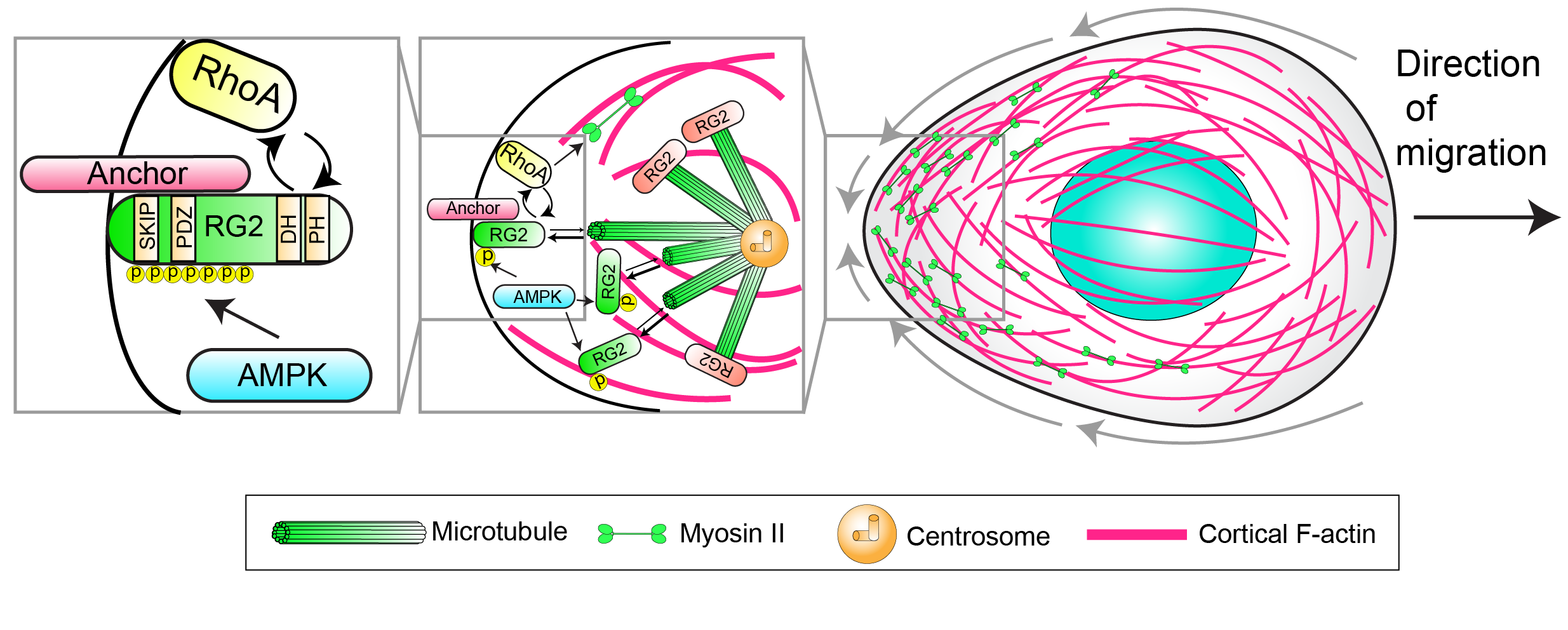 AMPK phosphorylates RhoGEF2 (RG2), locally liberating it from inhibitory microtubule interactions. RhoGEF2 then drives the activation of RhoA, which in turn activates myosin II at the rear.